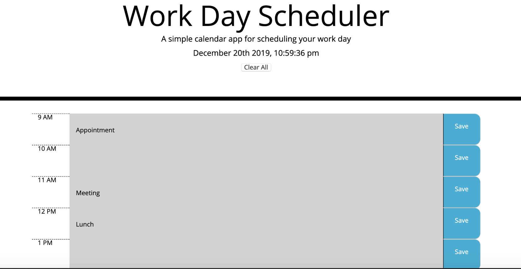 A calendar application that allows users to save events to different hours of the business day. The app tracks the date and time in real time and dynamically updates accordingly.