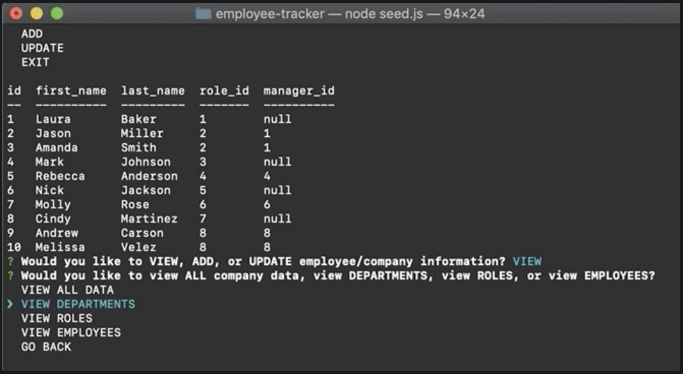 A command line program that acts as a content management system for an organization. This application allows users to view and manage departments, employees and roles within a company.