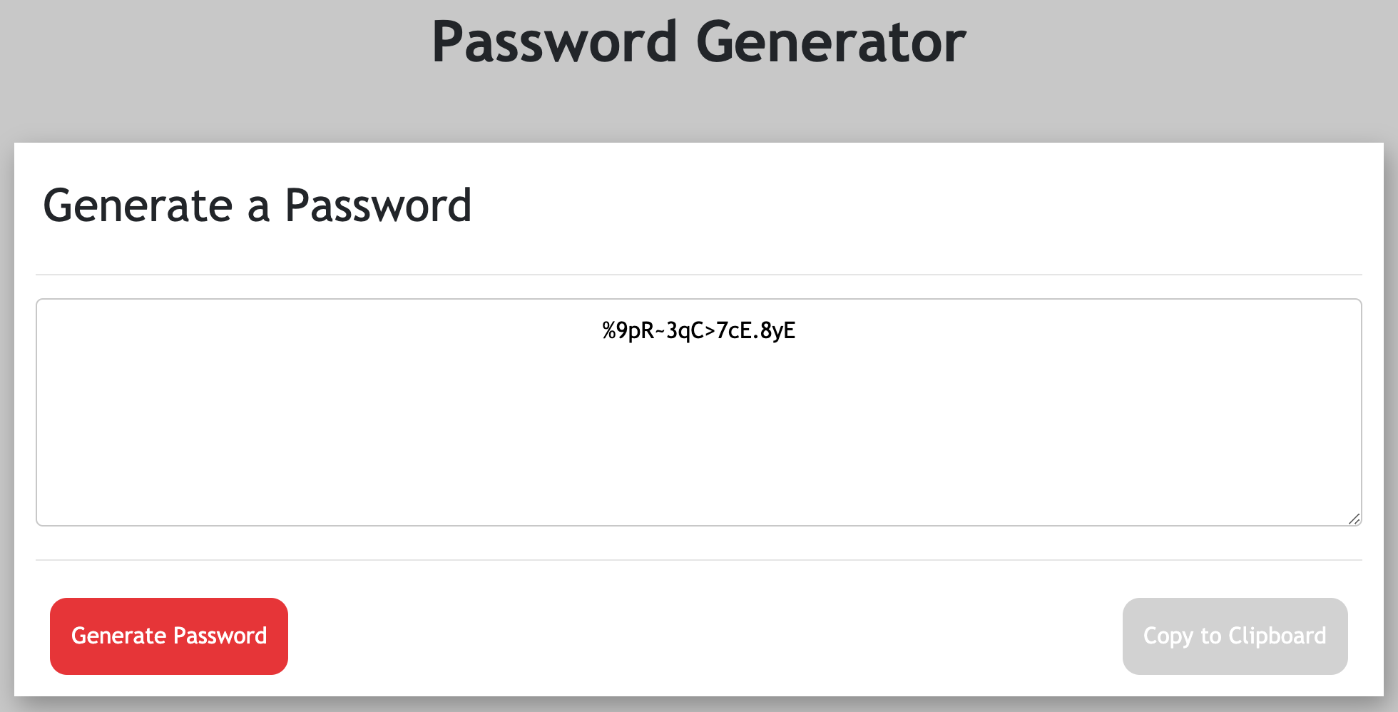 A web application used to generate a random and secure password based on user-specified criteria, such as number of characters and whether or not to include special characters, numbers, uppercase letters and/or lowercase letters.