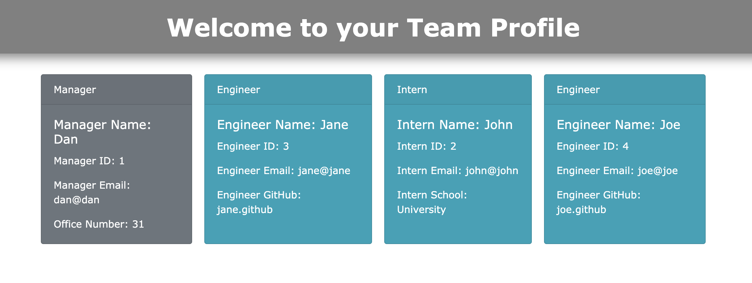 A command line program used to create a team profie for a software engineering team. The user is guided through prompts about their different team members, with the resulting information used to generate the team profile in the user's browser.
